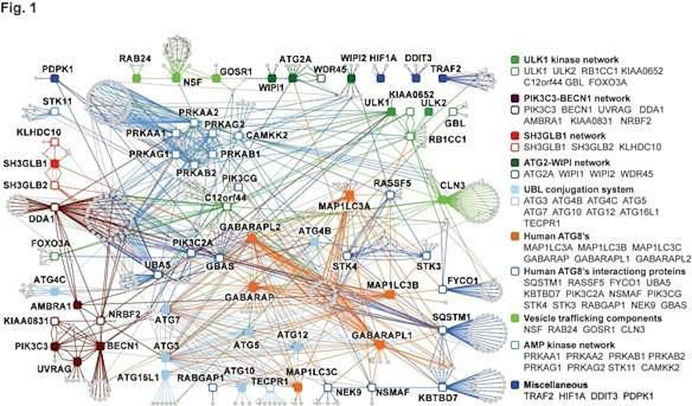 This is a protein interaction pathway built by Harper Lab at Harvard University describing the interactions between proteins involved in Macrophages (a type of white blood cell) eating other cells. It was built painstakingly over years or perhaps decades of research. It only contains the main interactions and it possibly misses some of the weaker interactions that happen in solution. Something that Fluidic’s platform does better than any existing technique.